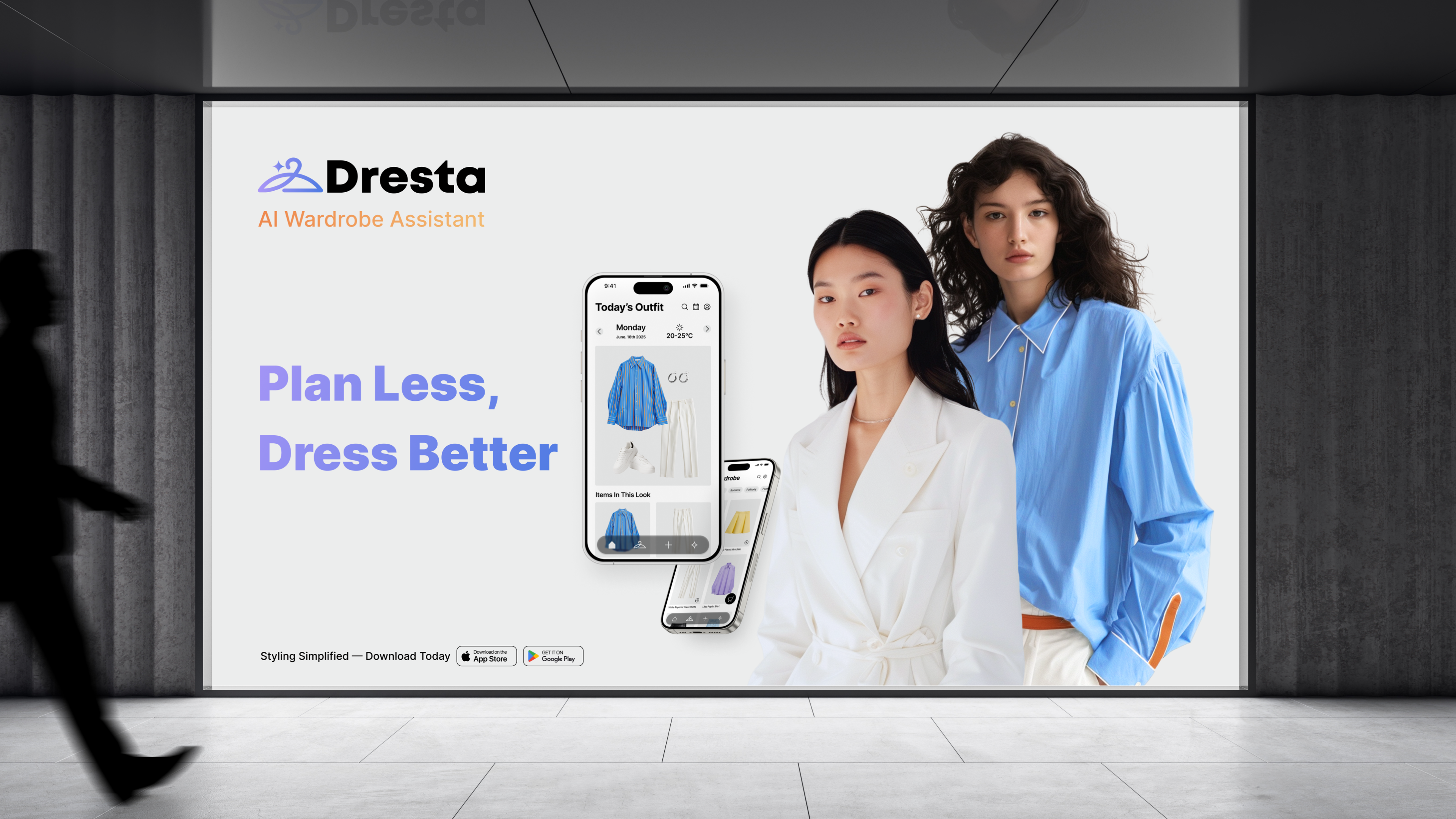Dresta is a branding and UI/UX project for an AI-powered wardrobe assistant that streamlines outfit planning — addressing styling fatigue and fashion overconsumption for urban professionals.